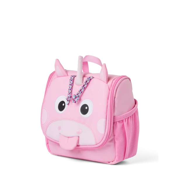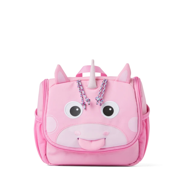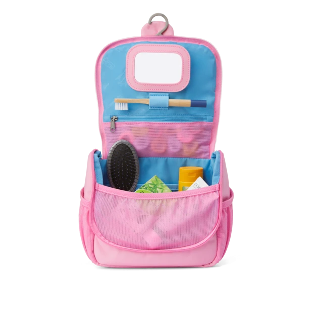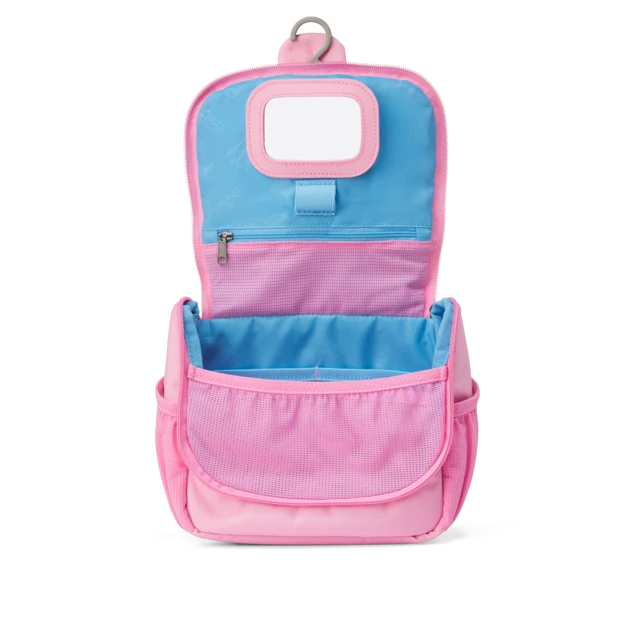 Mit seitlichen Mesch- Taschen außen und einer kleinen Reißverschlusstasche innen bietet sie viel Platz zum Ordnen. Sie werden erstaunt sein, wie ordentlich Ihr Kind sein kann! Besonders praktisch ist die Schlaufe für die Zahnbürste unter dem Spiegel und der versteckte Haken unter der Zunge.