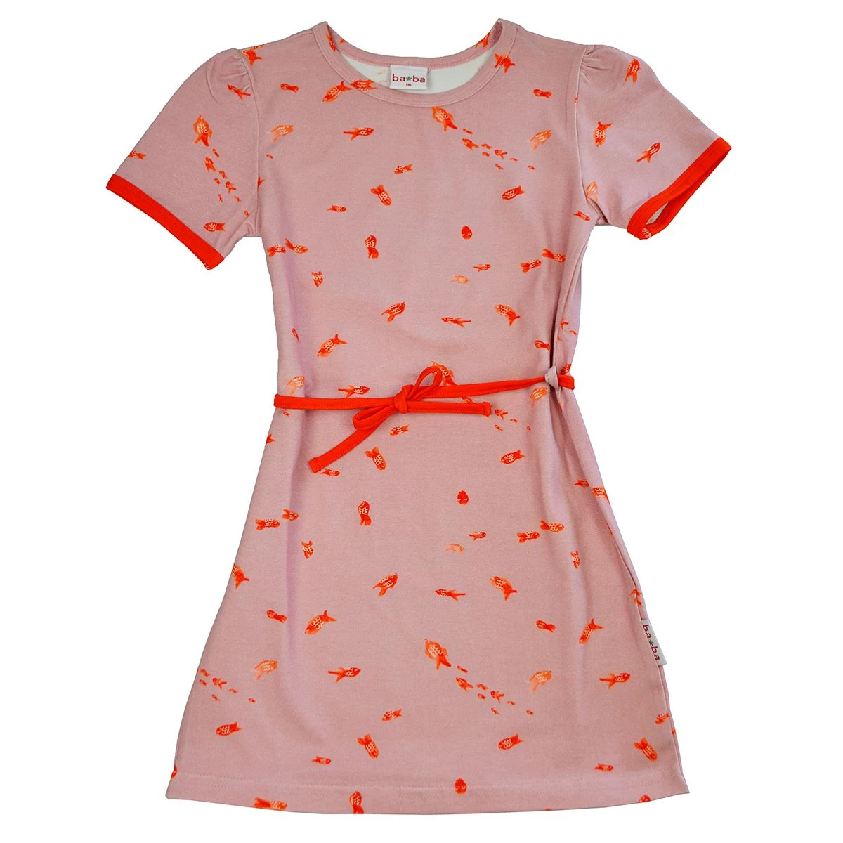 Kurzarmkleid mit ganz großen oder kleinen Fischen. Es kommt in feiner A- Linie geschnitten, mit Bindegürtel und kontrastfarbigen Saumeinfassungen. Mit seinem unkomplizierten Design passt es fast zu jedem Anlass und gibt ein modernes Sommeroutfit für große und kleine Mädels.