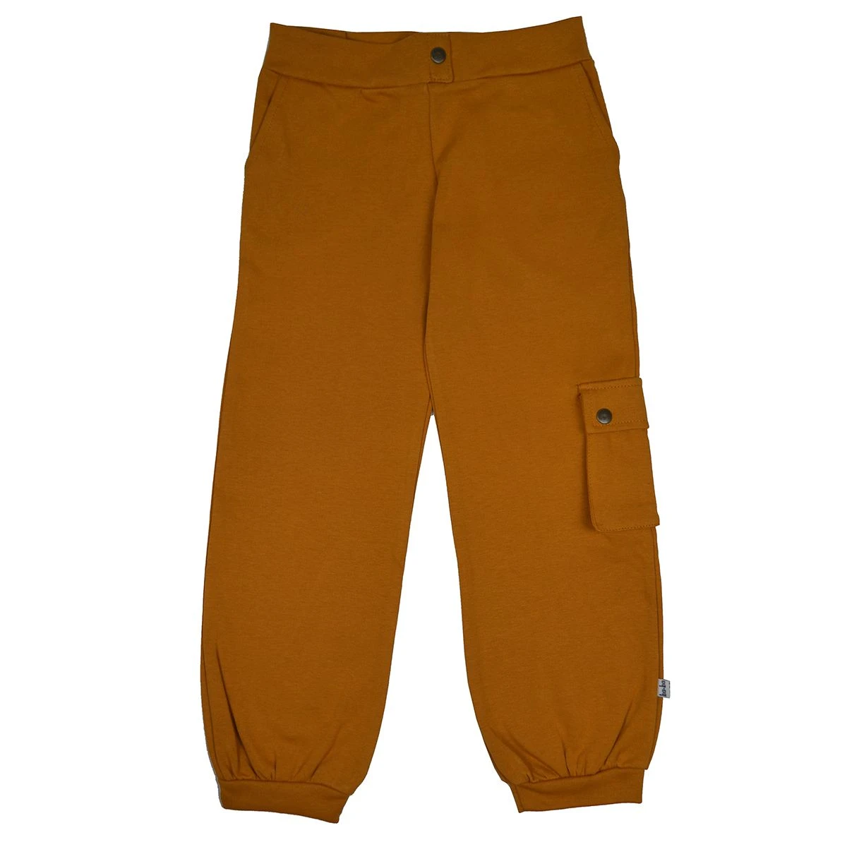 Weiche Cargohose für Jungen und Mädchen mit Beinbündchen, die leicht geschoppt auf den Schuhen enden. Die Beine sind bequem weit und in die aufgesetzte Tasche am linken Bein passen Schätze und unverzichtbare Mitnehmsel.