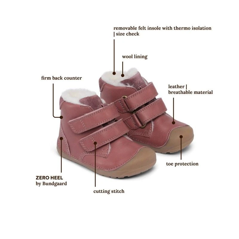 Winterschuh für Kleinkinder für Laufanfänger die zeitweise laufen oder krabbeln. Es ist ein sehr weiches und flexibles Modell mit einem Futter aus 100% Lammwolle, das Kinderfüße verlässlich wärmt. Der Schuh kommt klassisch aus Leder ohne Membran um Schwitzfüße zu vermeiden. Zunge & die Hinterseite sind mit Wildleder verarbeitet was drückende Faltenbildung vermeidet. Die weiche, flexible Gummisohle bietet Kinderfüßen im „Lauflernmodus“ genügend Bewegungsfreiheit.