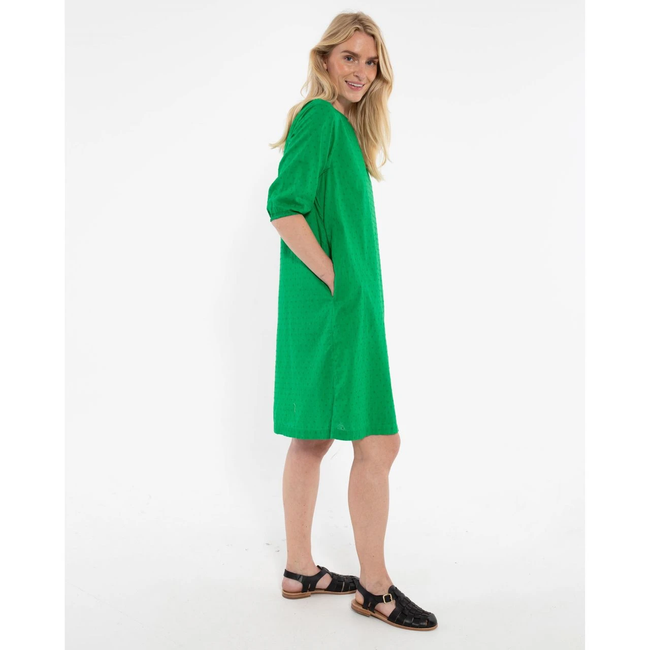 Leichtes Sommerkleid aus feinster leichter 100%- iger Baumwolle. Es hat eine bequeme Passform und schließt am Knie ab. Mit verspielten Puffärmeln, klassischem Rundhalsausschnitt und zwei dezenten Taschen bringt es nordisch zeitlosen Schick . Die leichte Qualität des Kleides macht es zu einem perfekten Sommerkleid, das leicht mit Sneakers, Sandalen oder High Heels kombiniert werden kann.
