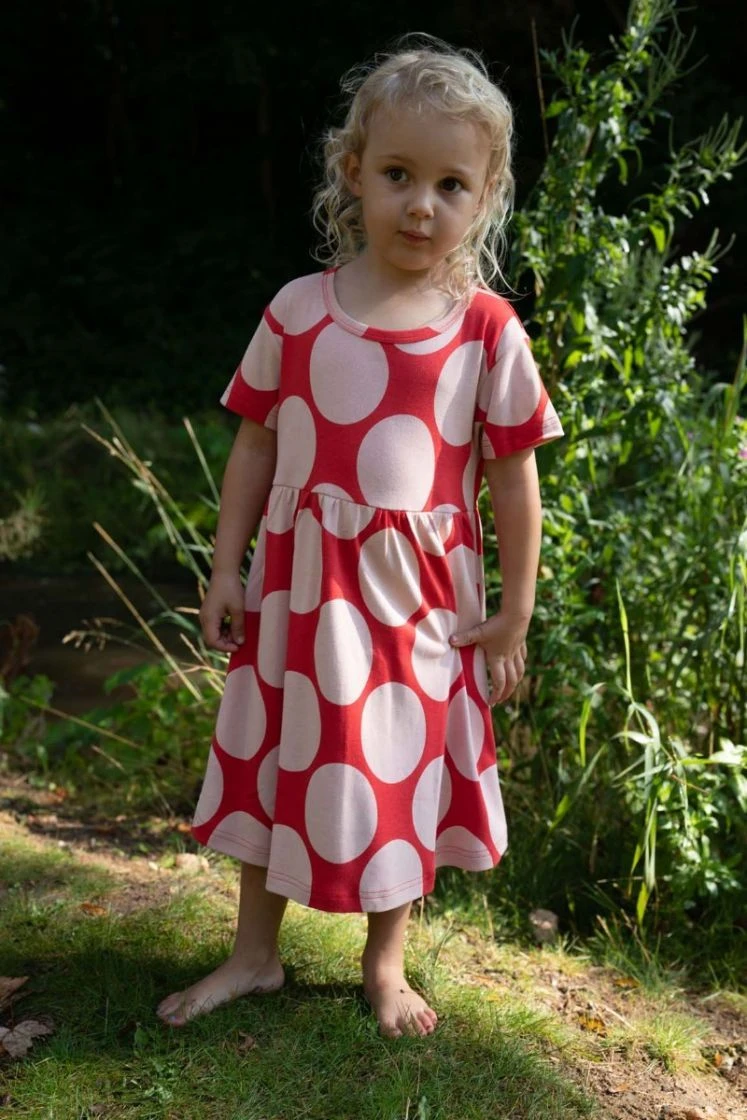 Wundervolles Kurzarmkleid aus BIO Baumwolle mit großen Punkten. Das Kleid hat eine super Passform und ist sowohl für Tante Gabis 60- en aber auch zum Spielen geeignet. Sein Rockteil schwingt weit und lädt ein zum Tanzen.
