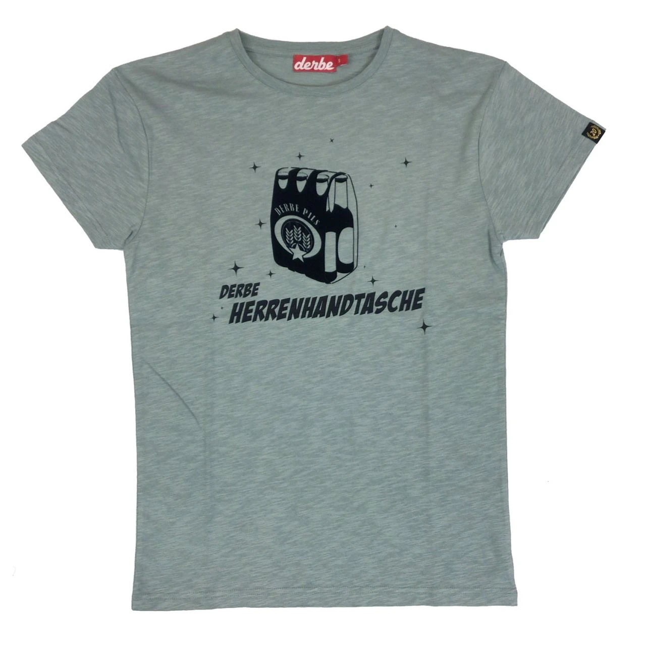 So weich kann T- Shirt! Melangiertes Herren Kurzarmshirt mit Rundhals und Sixpack- Print “HERRENHANDTASCHE”. Bequem geschnitten und aus weichem BIO Jersey. Derbe wird in dieser Saison 10 Jahre und kommt mit einer Jubiläumskollektion der besten Motive aus den letzten 10 Jahren. Wir gratulieren!!!