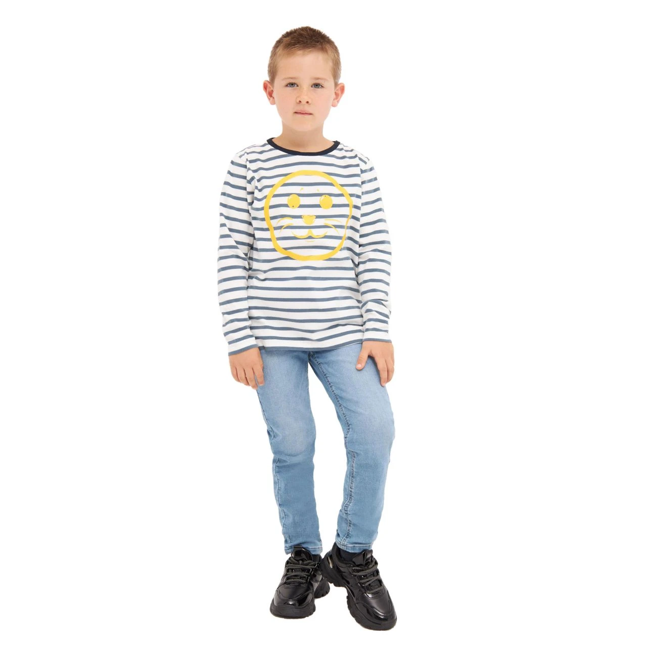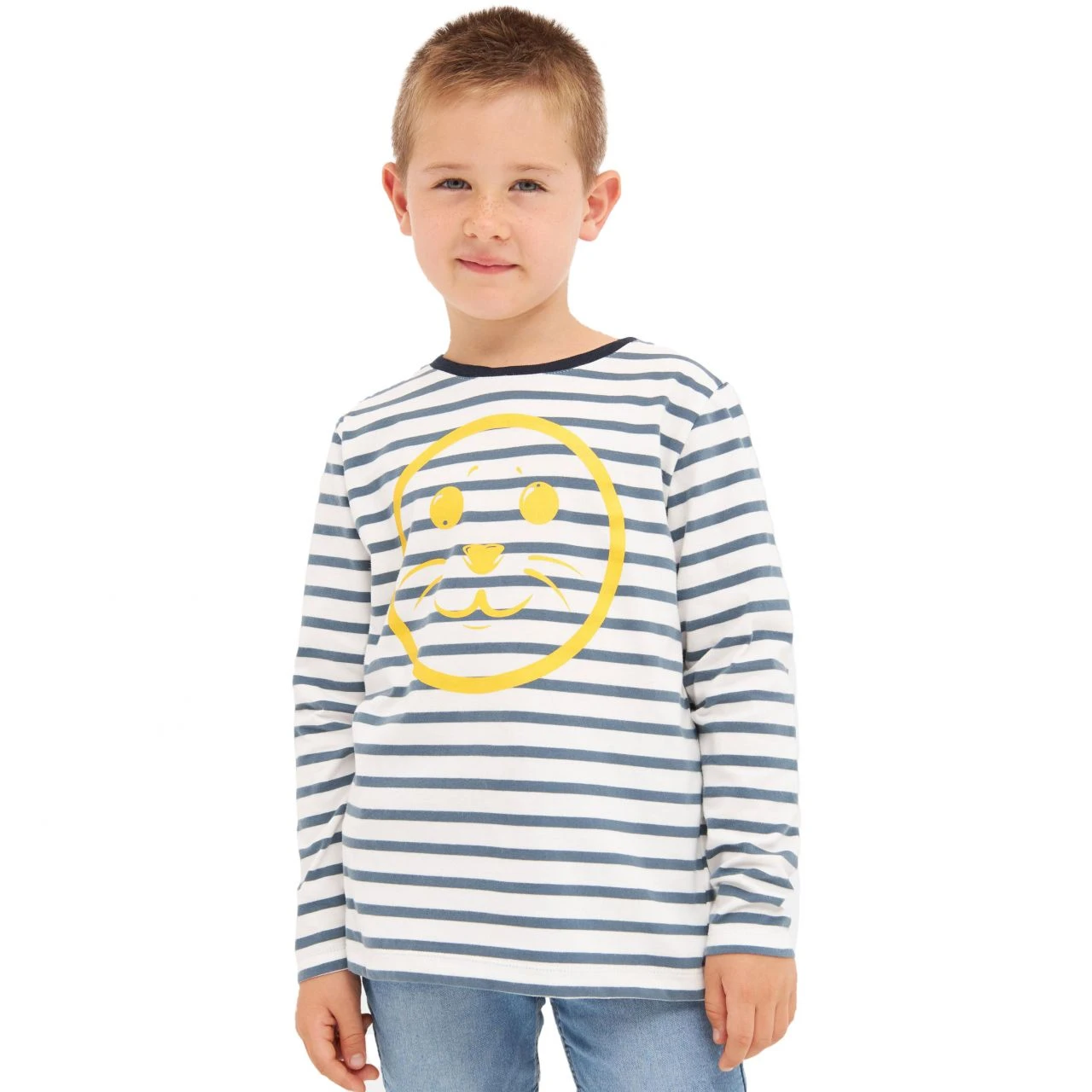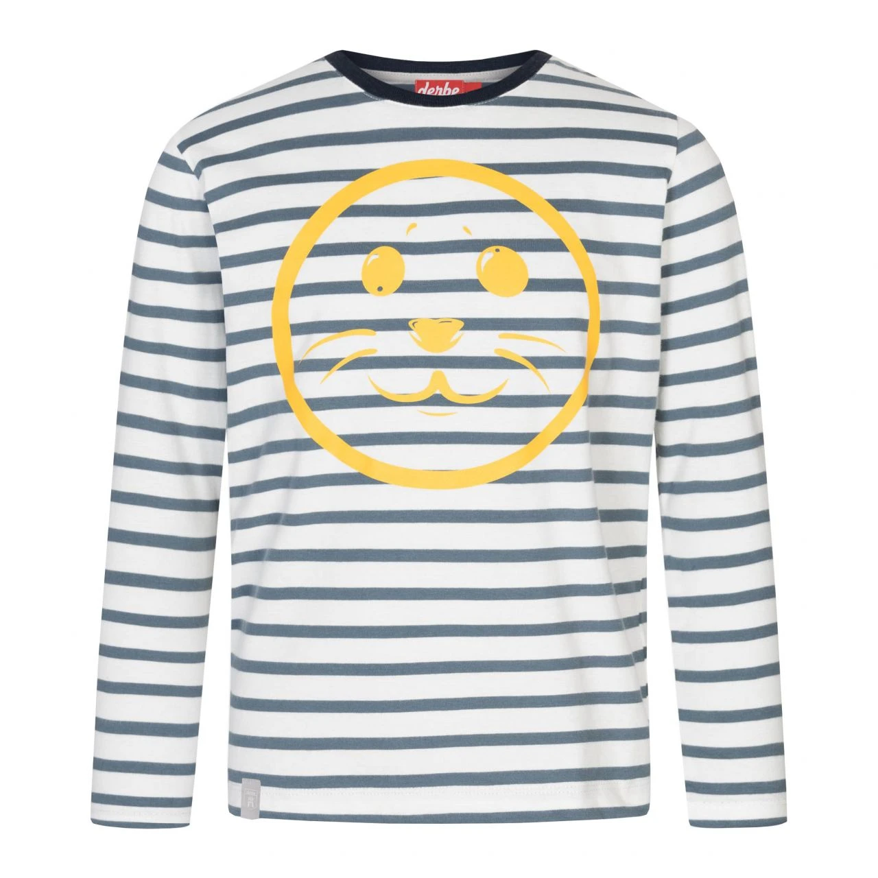 Kinder Lieblings- Langarmshirt mit maritimen Streifen. Es bringt einfach gute Laune! Mit dem zuckersüßen Robbensmily steckt es Freunde und Familie an. Das Shirt hat einen weichen Griff und bringt eine leicht melierte Leinenoptik mit. Das Material kühlt leicht und ist auch für ganz heiße Tage perfekt!