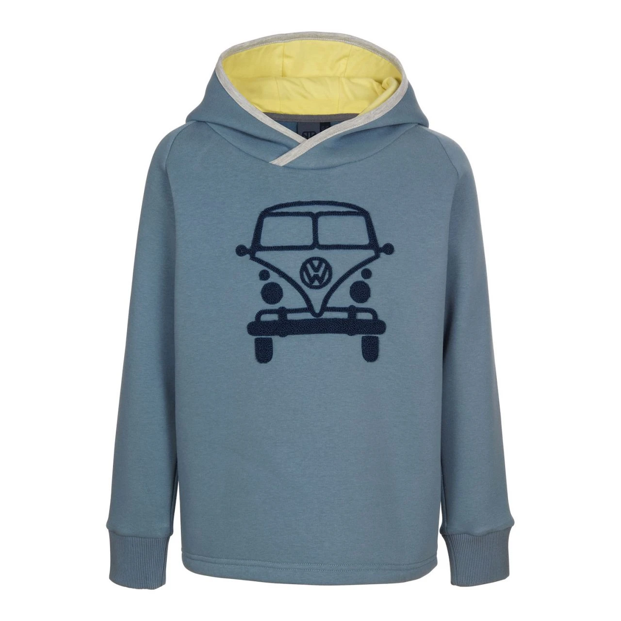 Flauschig weicher Hoodie für Kids mit VW Bulli Gesicht als haptischer Flockprint. Ärmel- Strickbündchen die sich gut krempeln lassen sorgen für längere Tragezeiten und die kontrastfarbig gefütterte Kapuze bringt die Sonne mit. Drunter und drauf getragen ist er perfekt für jede Jahreszeit!