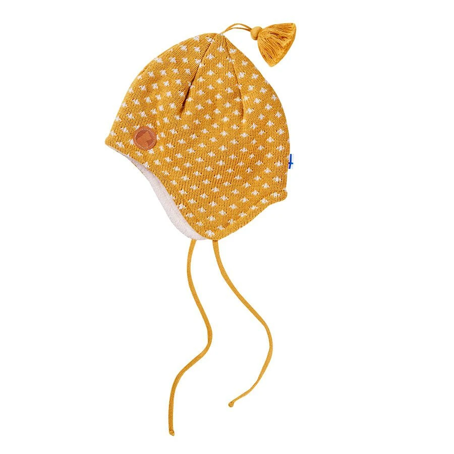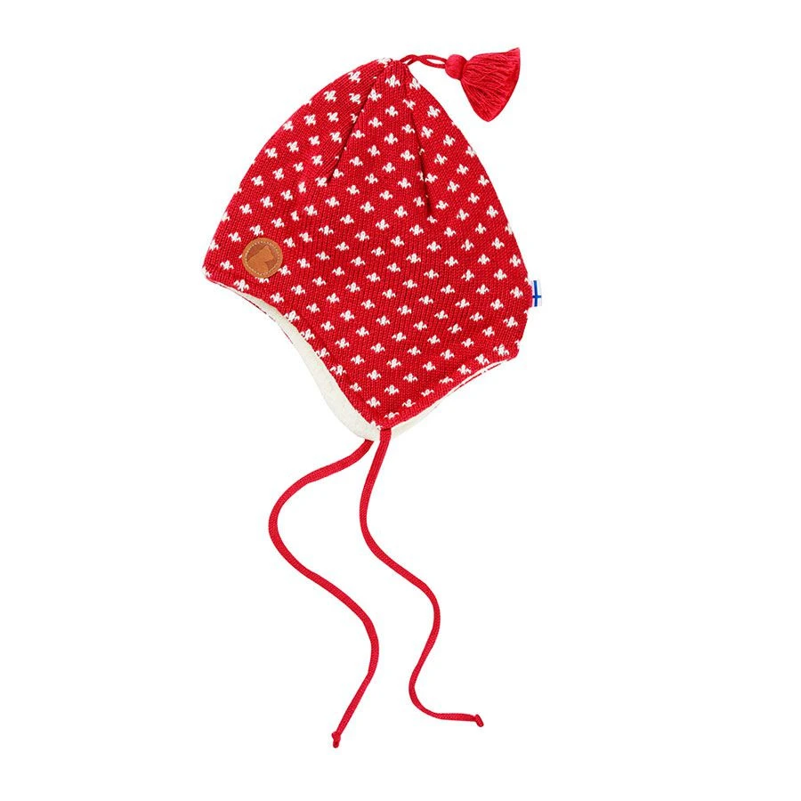 Zipfelstrickmütze mit naturfarbenem Sternmuster aus Baumwolle und mit Baumwollfleece innen warm gefüttert. Verspielt mit kleiner Quaste am Zipfel, und passgenau durch ausgeschnittene Ohrenklappen und Bindebänder.