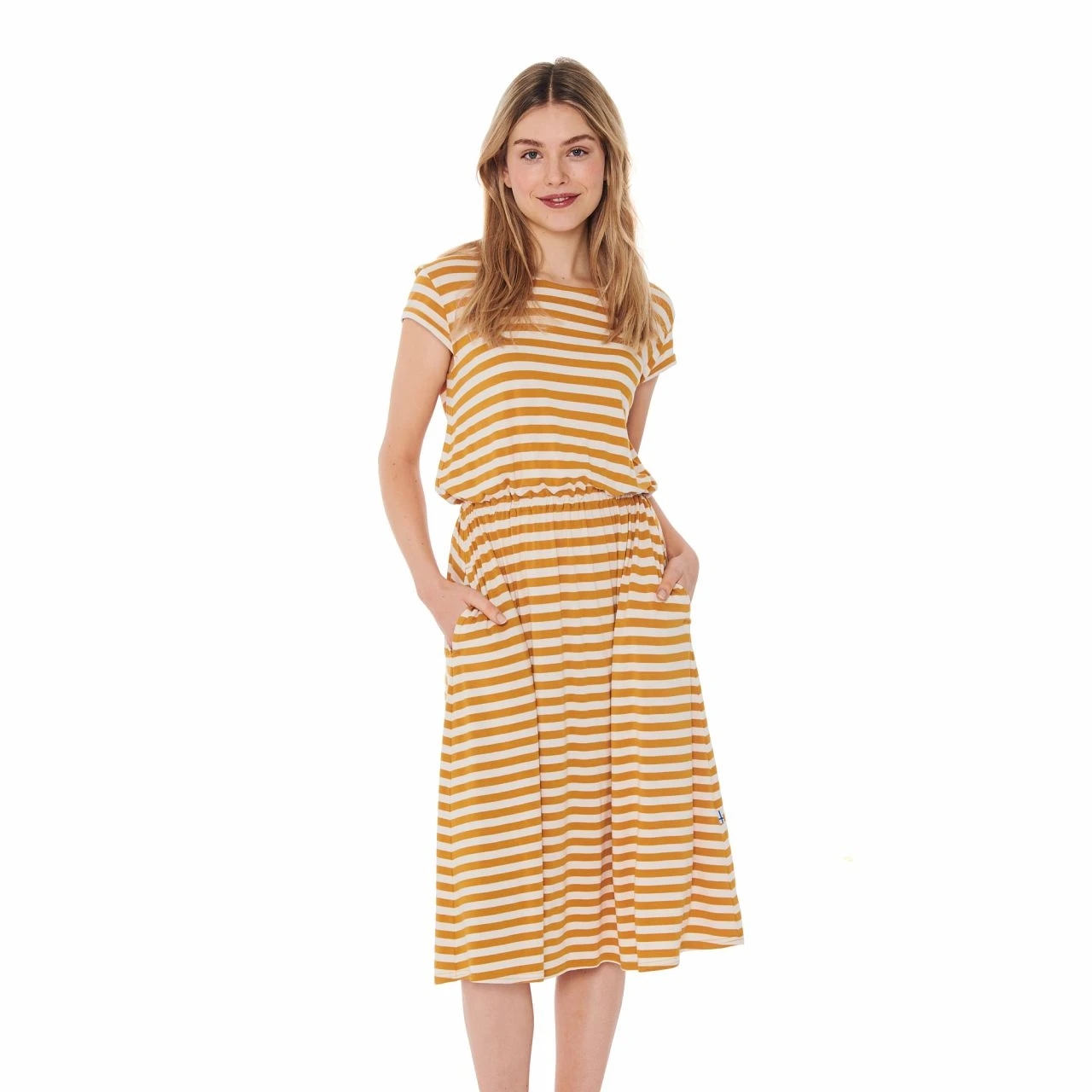 Damen Kurzarm- Streifenkleid aus einem umweltfreundlichen Bambuss- Mischgewebe das an warmen Tagen leicht kühlt. Mit elastischem Taillengummi lässt es sich einfach in Form bringen. Ein unkompliziertes leichtes Sommerkleid für den Alltag, Feste und Spaziergänge.