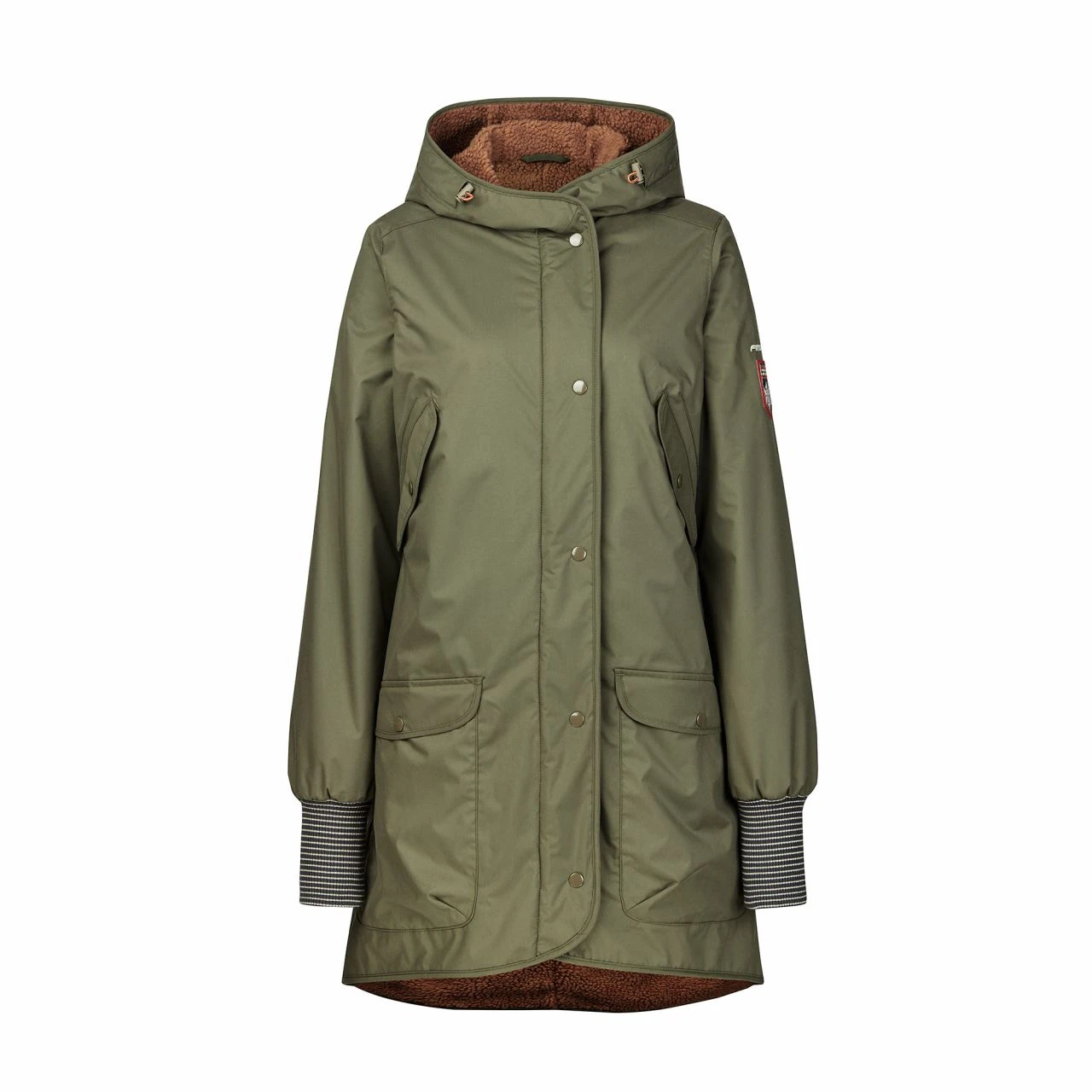 Die weiche Fleeceseite kommt mit Seitentaschen, kultigem Holzknebelknopf und Labelstickerei.