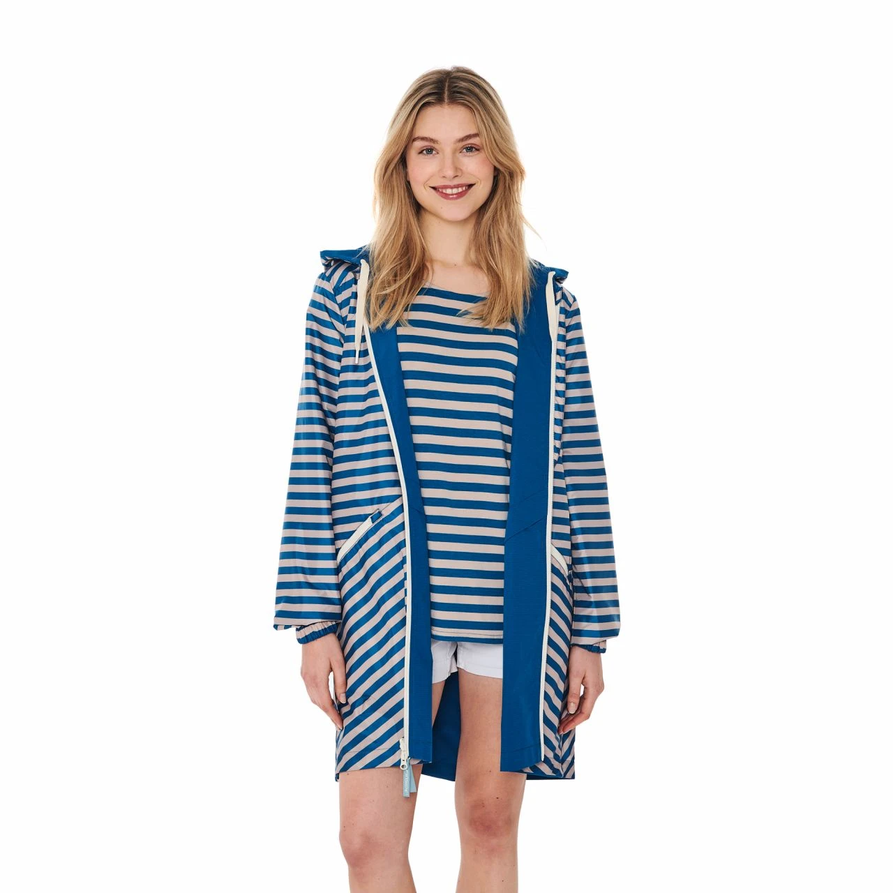 Er hält Dich bei Regenwetter trocken und lässt dich bei Sonnenschein leuchten. Der wendbare Damen Regenmantel VOIMA kommt mit wetterfester Außenseite und lustige geringelter Innenseite. Er ist atmungsaktiv, wasserdicht und Schmutz abweisend. Für den Partnerlook mit Tochter oder Sohnemann ist die wendbare Kinderjacke VALAS ebenfalls bei uns im Shop bestellbar.