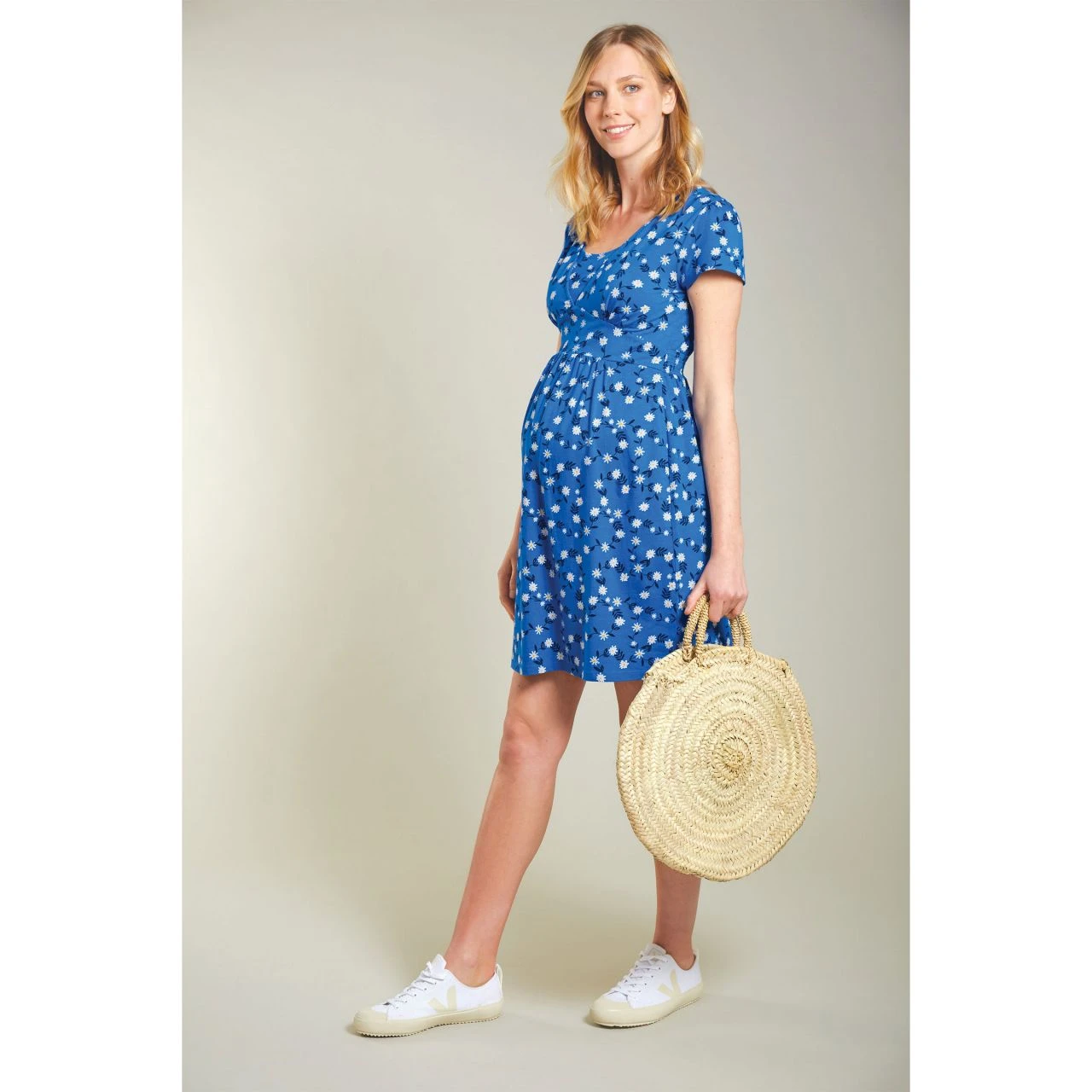 Stillkleid mit dem Gänseblümchen- Print mit klassischen blau-weißen Details. Es ist wie gemacht für sonnige Tage, Sommerwochenenden und Spaziergänge. Knielang geschnitten hat es ein schmeichelhaftes Band an der Taille, das Ihren wachsenden Bauch perfekt umspielt, und einen elastischen Rücken, der während der gesamten Schwangerschaft und darüber hinaus einen bequemen Sitz gewährleistet. Unter dem V- Ausschnitt befindet sich ein Einsatz der bequem zum Stillen freigelegt werden kann.