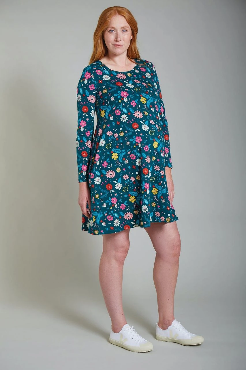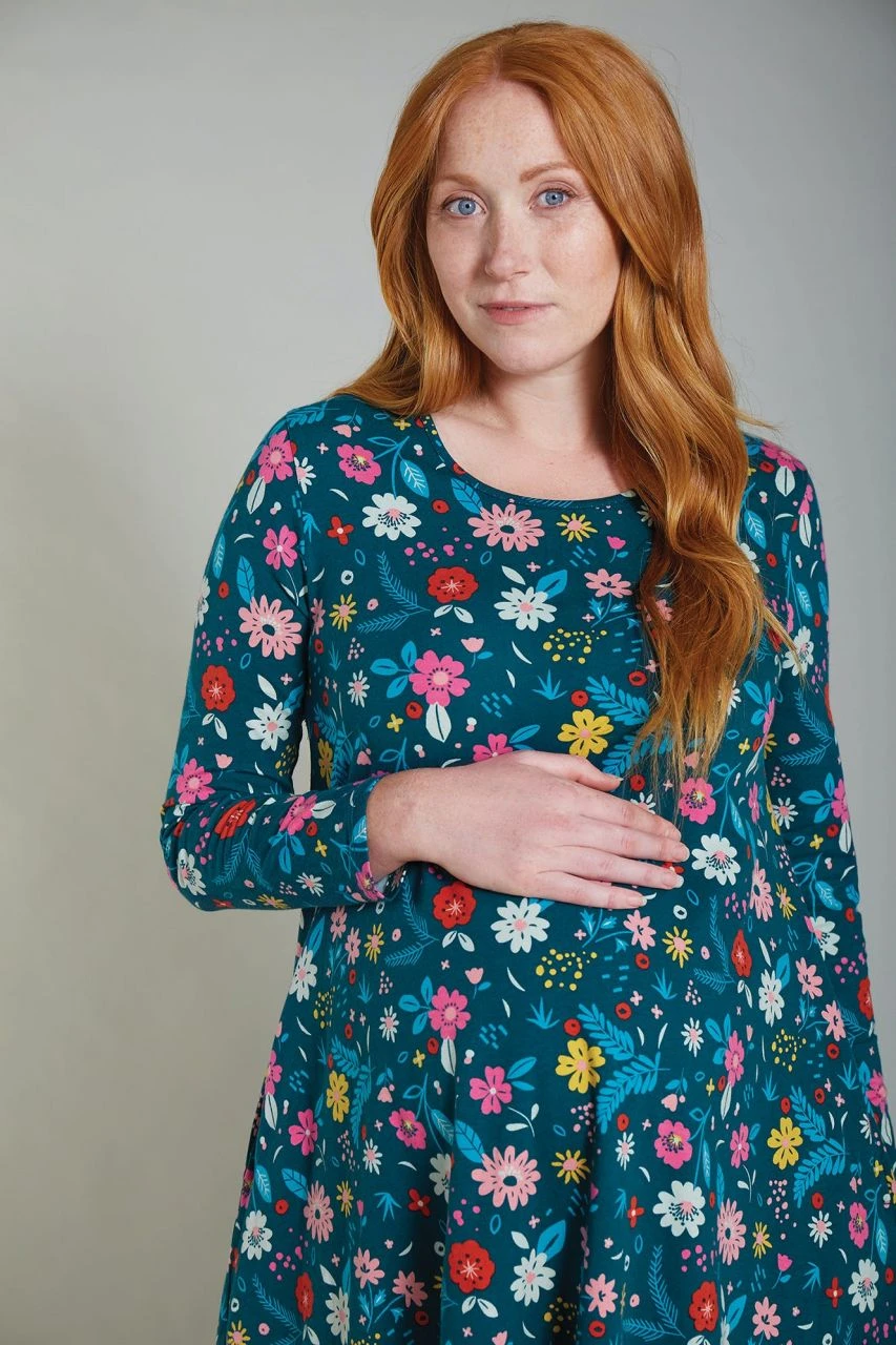 Weiches Schwangerschaftskleid aus der Frugi Bloom-Kollektion die extra für werdende Mütter gemacht ist.