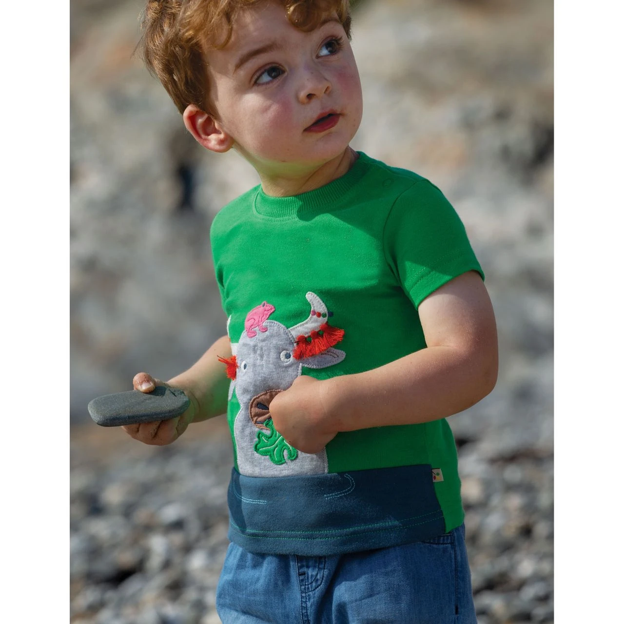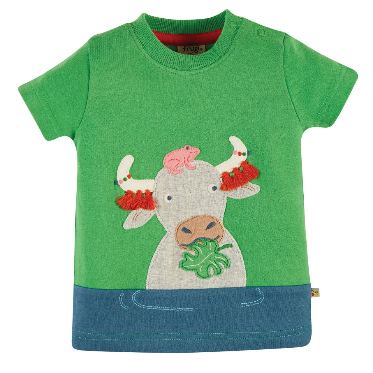 Ein Büffel steht im Wasser und kaut genüsslich ein Blatt und der Frosch quakt ein Lied zur Mahlzeit. Das PENRYN- T-Shirt kpmmt mit einer 3- D Applikation bei dem sich die Quasten an den Büffelhörnern im Wind bewegen können. Colorblock- Design in Verbindung mit einen tollen Motiv.
