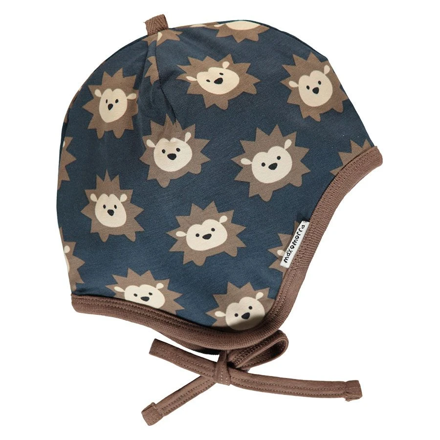 Maxomorra Babymütze aus doppellagigem weichem Biobaumwoll- Jersey. Sie kann gebunden werden und und das leicht strechige Material schmiegt sich an den Babykopf an. Die seitlichen Ohrenklappen schützen die Lauscherchen wenn der Wind mal etwas stärker pustet.