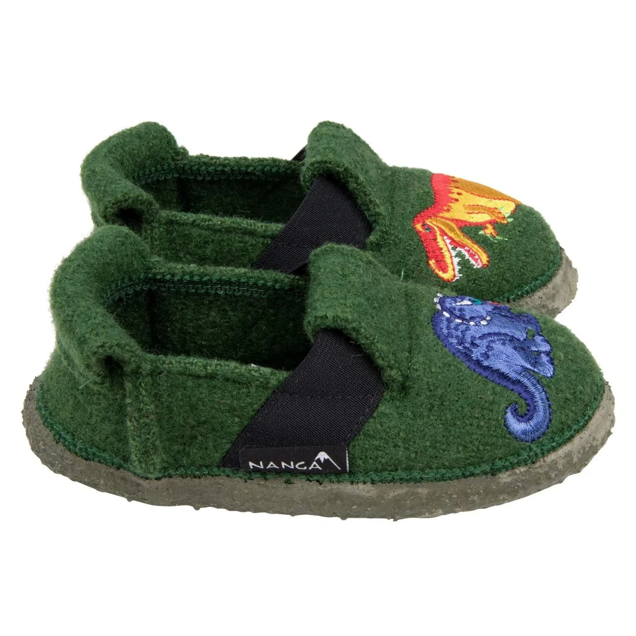 Kinder- Schlupf- Hausschuhe für kühle Tage aus weicher kratzfreier Schurwolle mit feinem Futter und elastischem Gummi über dem Spann. Mit dem spacigem geteilten DINO Motiv lernen Kinder einfach zwischen dem rechten und dem linken Schuh zu unterscheiden. Die Hausschuhe umschließen den Fuß und sitzen gut. Ein elastischer Fersenabschluss erleichtert den Kleinen das Rein- und Rausschlüpfen. Die Sohle aus 100% Naturkautschuk ist direkt an den Schuh gegossen und kommt mit einem Relief, das Ihrem Kind Trittsicherheit und einen festen Stadt gibt.