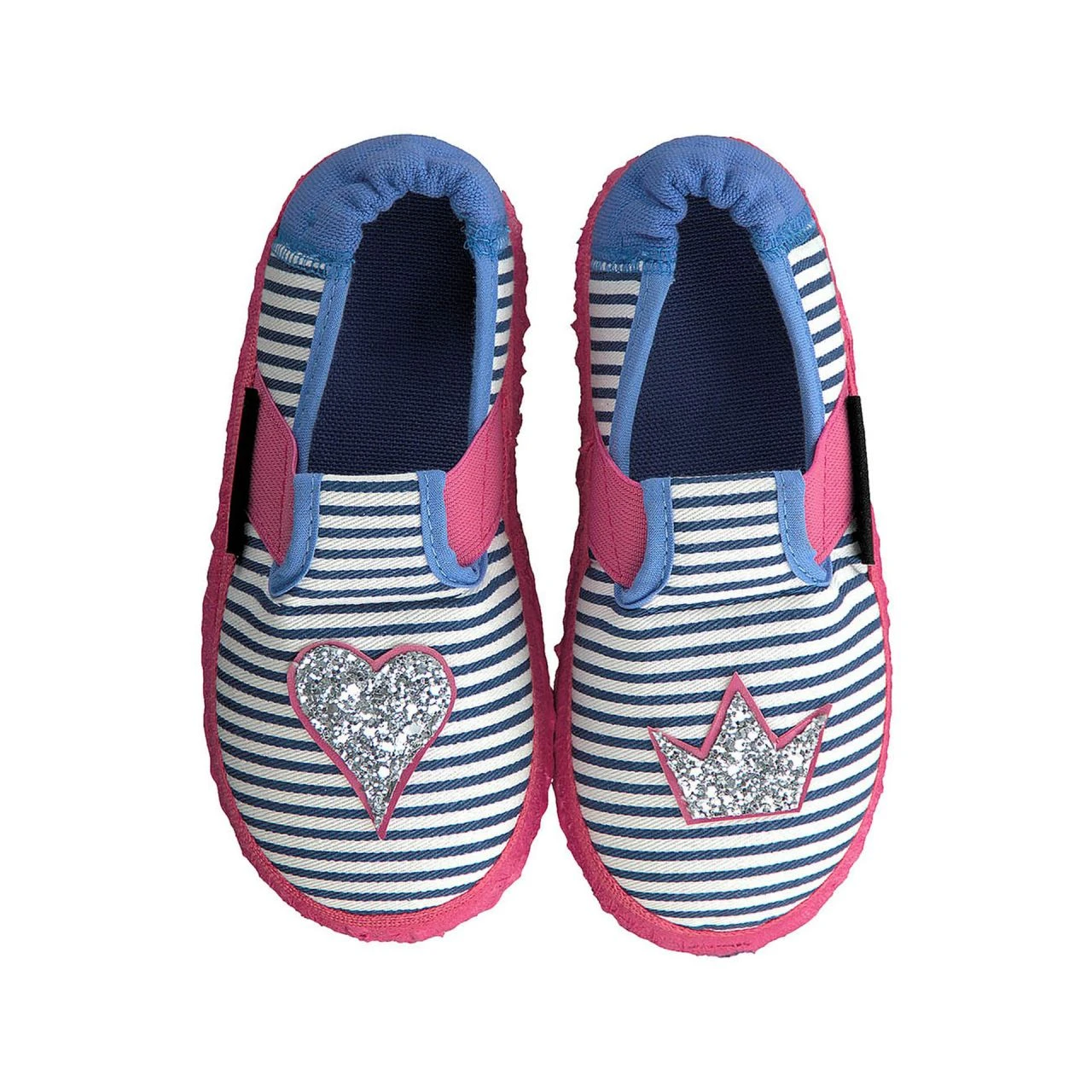 Kinder- Schlupf- Hausschuhe aus weicher Baumwolle mit feinem Futter und elastischem Gummi über dem Spann. Mit dem glitzernden “HERZKLOPFEN” Motiv, lernen Kinder einfach zwischen dem rechten und dem linken Schuh zu unterscheiden. Die Hausschuhe umschließen den Fuß und sitzen gut. Ein elastischer Fersenabschluss erleichtert den Kleinen das Rein- und Rausschlüpfen. Die Sohle aus 100% Naturkautschuk ist direkt an den Schuh gegossen und kommt mit einem Relief das Ihrem Kind Trittsicherheit und einen festen Stadt gibt.