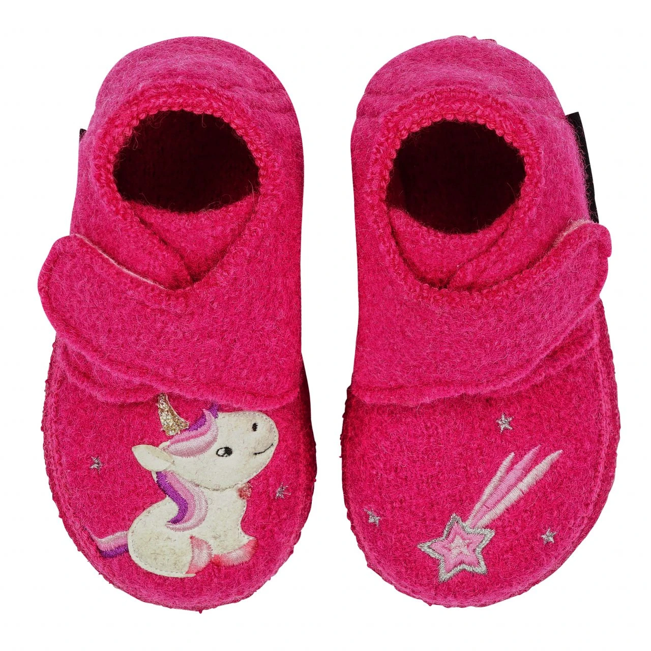 Kinder- Schlupf- Hausschuhe aus weicher Baumwolle mit feinem Futter und Klettband am Knöchel das den Kleinen das Rein- und Rausschlüpfen erleichtert. Mit dem lustigen KLEINES EINHORN Motiv, lernen Kinder einfach zwischen dem rechten und dem linken Schuh zu unterscheiden. Die Hausschuhe umschließen den Fuß und sitzen gut. Die Sohle aus 100% Naturkautschuk ist direkt an den Schuh gegossen und kommt mit einem Relief das Ihrem Kind Trittsicherheit und einen festen Stadt gibt.