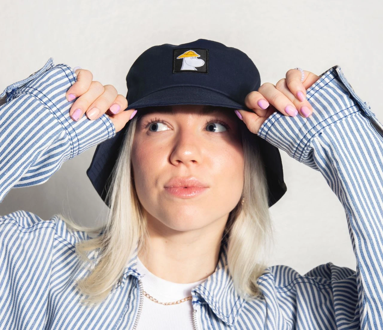 Sonnenhut mit farbigem MOOMIN- Patch auf der Vorderseite. Die breite Krempe schützt das Gesicht und den Nacken zu vielen Strahlen. Ein aufwändig genähter Hut, trendy und super praktisch.