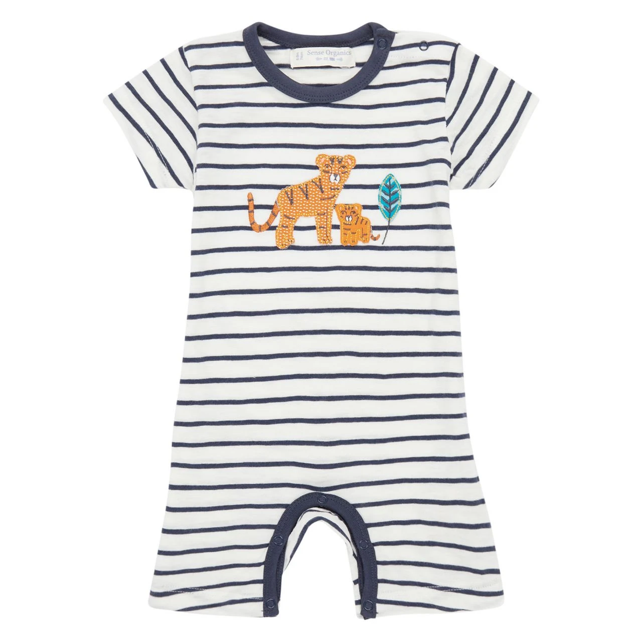 Maritim geringelter Sommeroverall aus sommerfrischem Slub- Jersey mit Tigerapplikation und kontrastfarbig eingefassten Saumabschlüssen. An den Schultern und im Schritt erleichtern Druckknöpfe das Anziehen und das Wechseln der Windel.